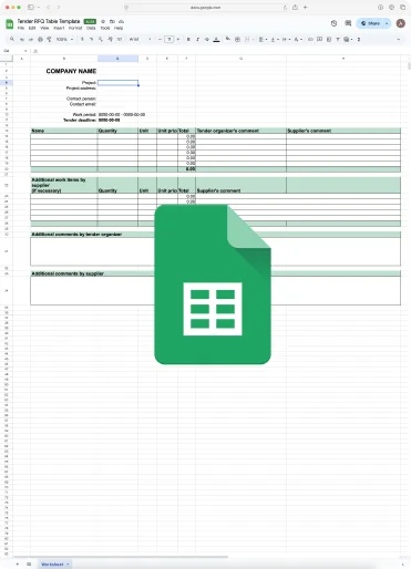 A construction tender RFQ table template is used to request and compare supplier or subcontractor pricing for defined scopes of work. It provides a structured format for listing work items, quantities, unit prices, totals, and comments from both the tender organizer and suppliers.