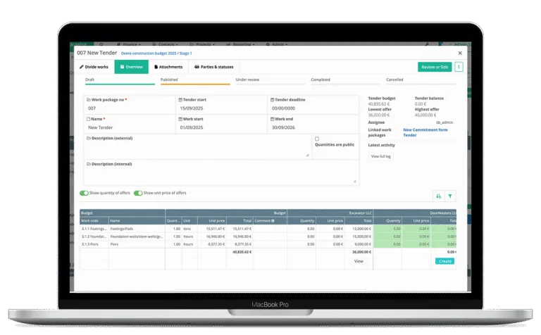 Create tender packages directly from budget lines. Define tender line items to match the intended pricing structure and improve clarity in contractor responses. The breakdown ensures that incoming pricing aligns with the cost control framework and project budget, delivering detailed, comparable and consistent tender quotations across all bidders.
